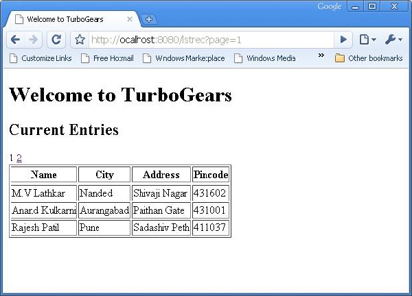 <html xmlns = "http://www.w3.org/1999/xhtml" xmlns:py = "http://genshi.edgewall.org/"> <head> <link rel = "stylesheet" type = "text/css" media = "screen" href = "${tg.url('/css/style.css')}" /> <title>Welcome to TurboGears</title> </head> <body> <h1>Welcome to TurboGears</h1> <py:with vars = "flash = tg.flash_obj.render('flash', use_js = False)"> <div py:if = "flash" py:replace = "Markup(flash)" /> </py:with> <h2>Current Entries</h2> <table border = '1'> <thead> <tr> <th>Name</th> <th>City</th> <th>Address</th> <th>Pincode</th> </tr> </thead> <tbody> <py:for each = "entry in entries"> <tr> <td>${entry.name}</td> <td>${entry.city}</td> <td>${entry.address}</td> <td>${entry.pincode}</td> </tr> </py:for> <div>${tmpl_context.paginators.entries.pager()}</div> </tbody> </table> </body> </html>