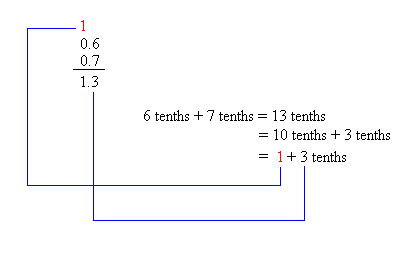 Notice that adding the tenths will give a number higher than 10 tenths or 1. Therefore, to add these decimals, we must carry over a 1 to the ones place. Recall also that 1 tenth = 0.1, so 10 tenths = 10 × 0.1 = 1